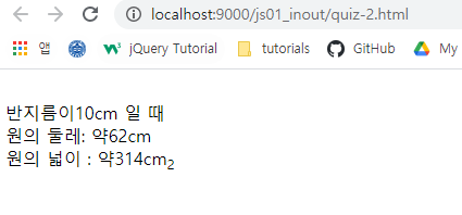 document.write("반지름이" + r + "cm 일 때" + "<br> 원의 둘레: 약" + circle1.circumference() + "cm <br> 원의 넓이 : 약" + circle1.area() + "cm<sub>2</sub>");