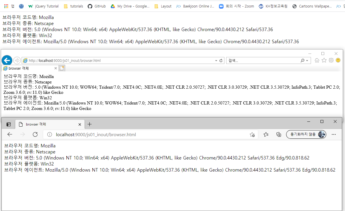 document.write("브라우저 에이전트: " + navigator.userAgent + "<br/>");