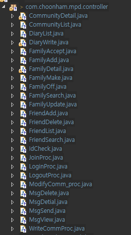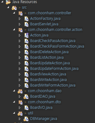 이 경우는 Servlet이 너무 많아서 애초에 코딩을 하기가 좀 빡세기 때문에 Servlet을 나누는 것이 아닌, Action이라는 이름의 인터페이스를 구성하고, 해당 인터페이스를 구현받는 일반 클래스를 생성하여 DAO를 제어하는 것이 좀 더 알맞는 의미의 MVC 패턴이라고 할 수 있다.