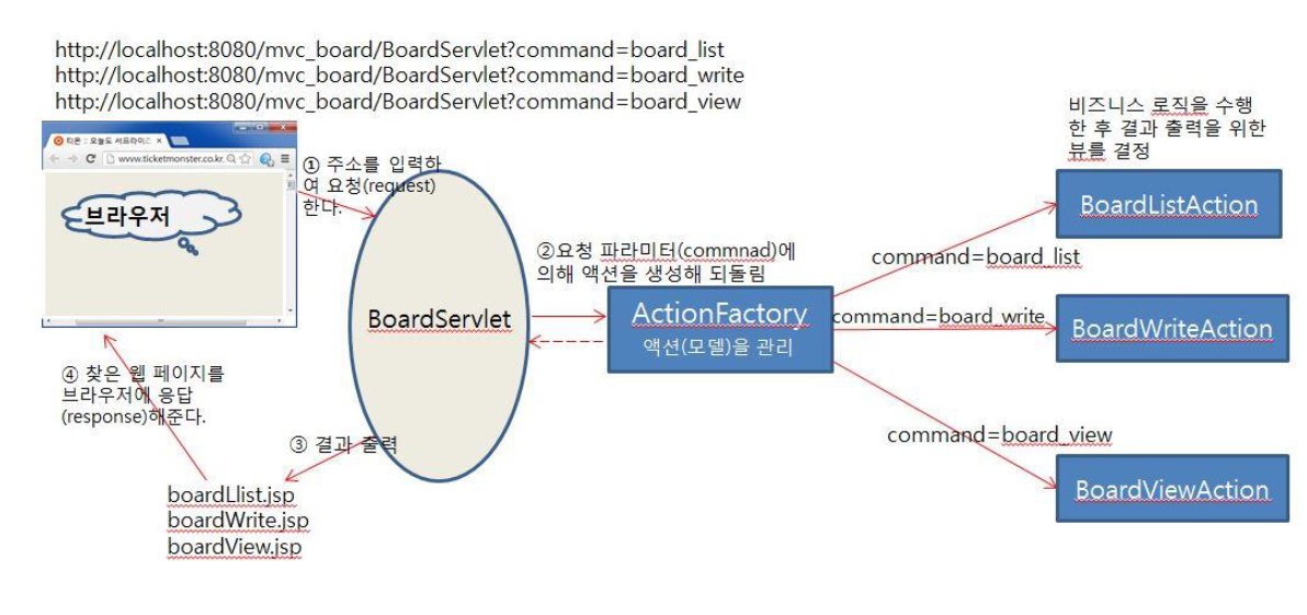 사실상 위 두개의 객체가 cotroller의 전부이다. 즉, ActionFactory에서 getAction 메서드가 command 값을 인자로 받아 Action 인터페이스를 구현 받은 action 클래스들 중 알맞은 기능을 가진 Action을 호출하여 각 기능을 수행할 수 있게끔 해주는 것이다.