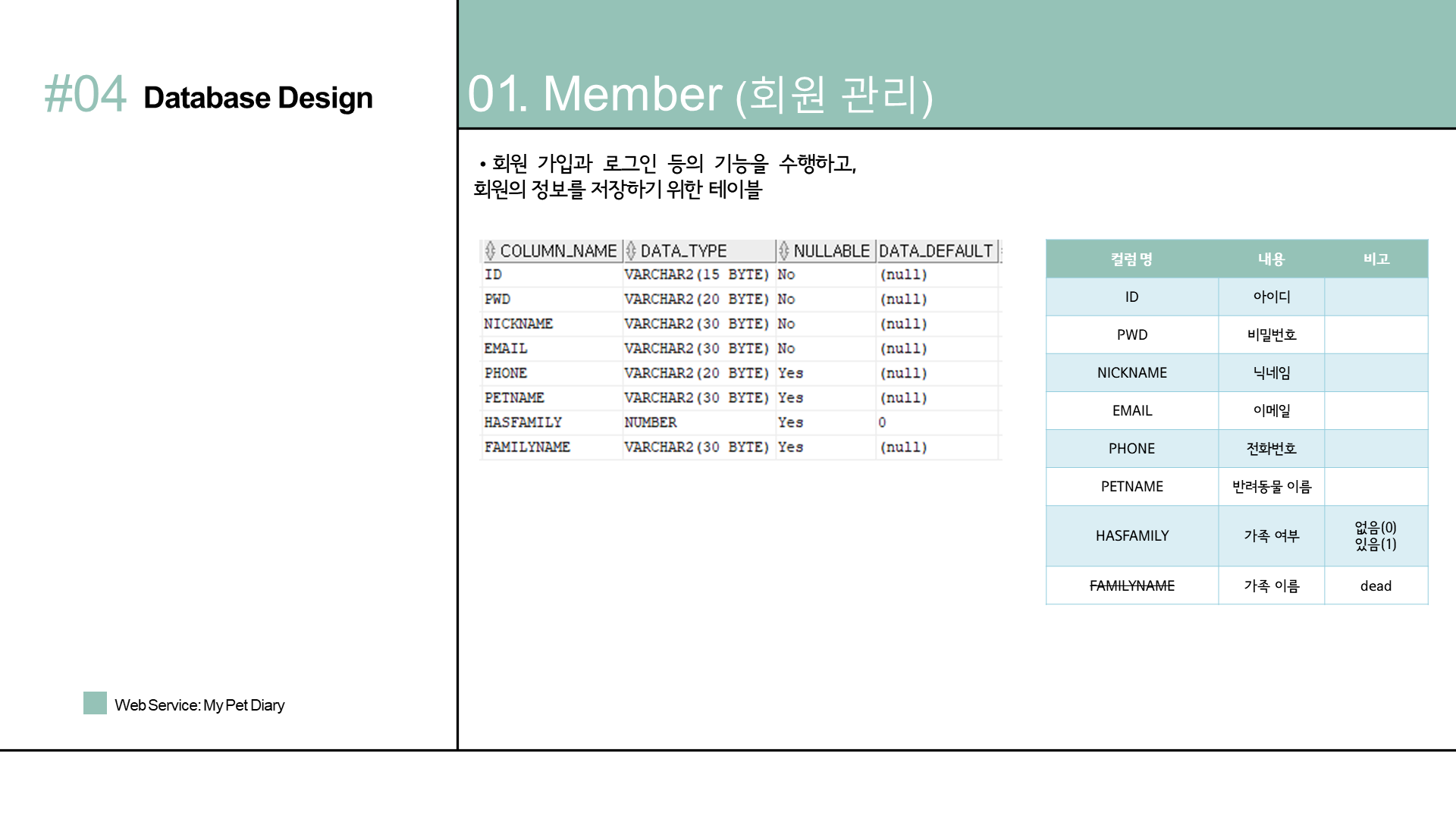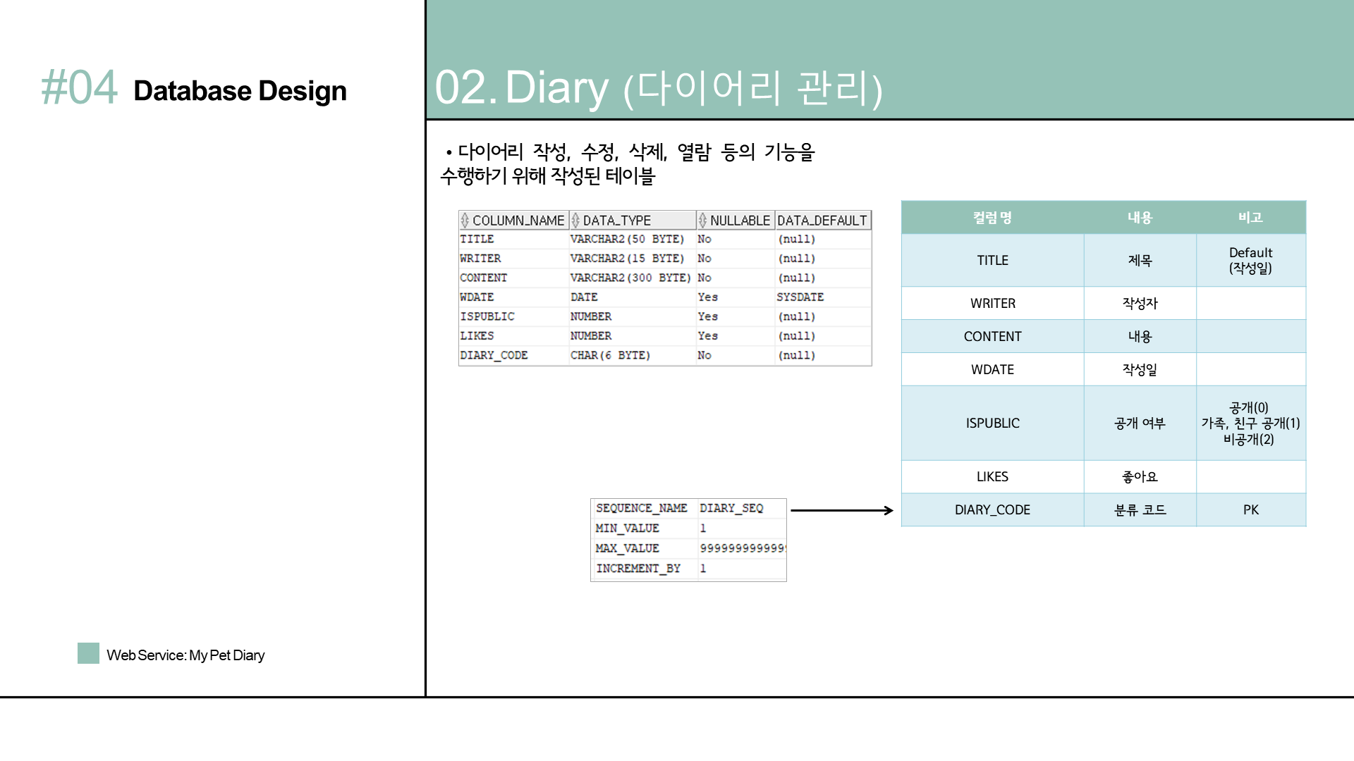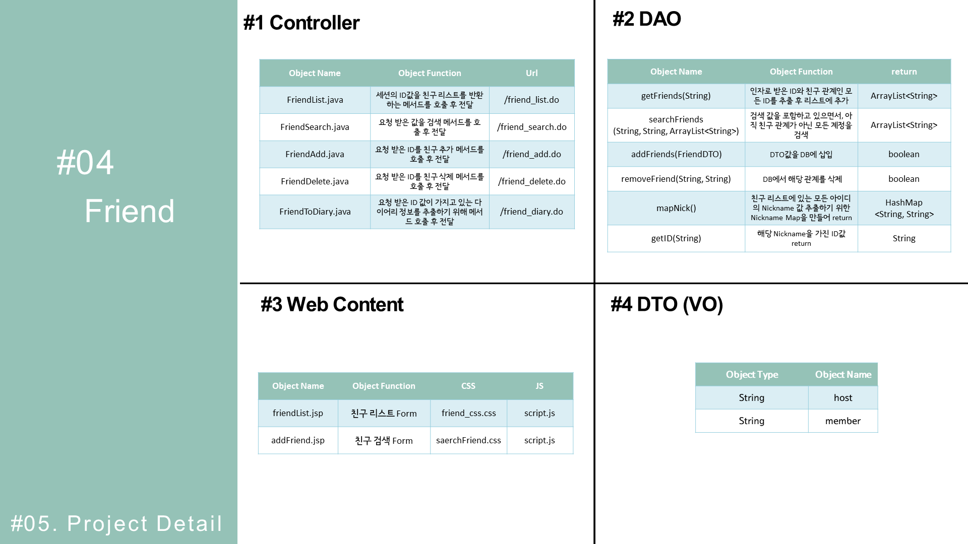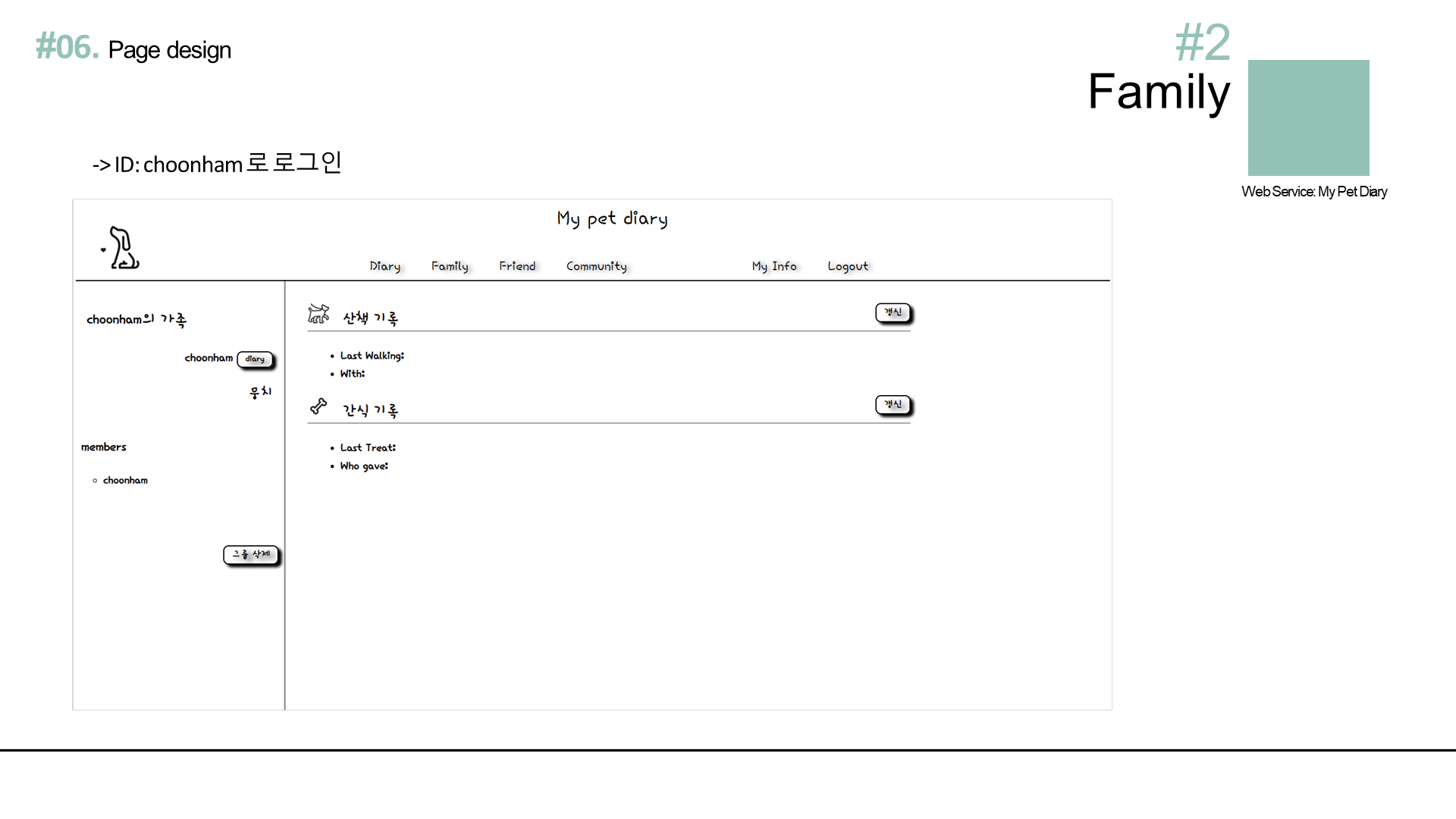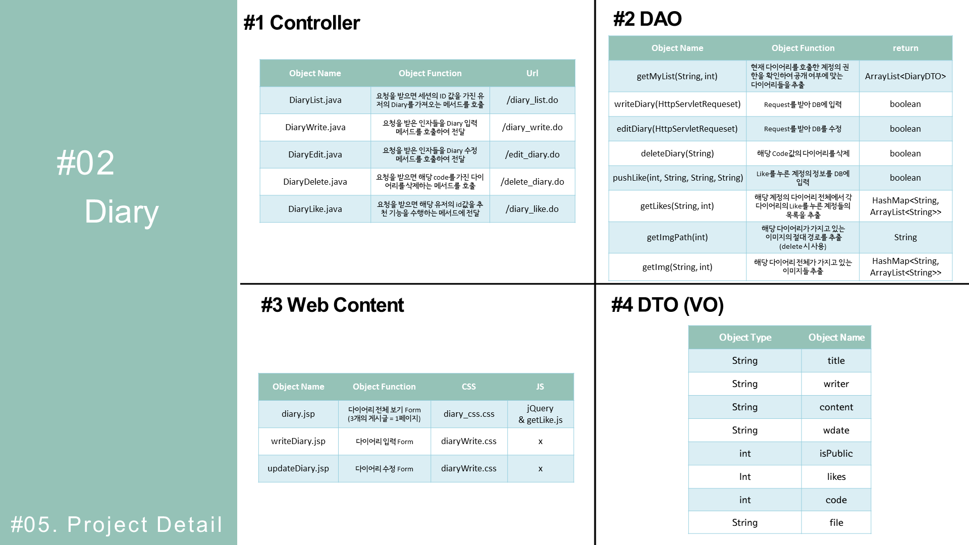 전체적인 프로젝트의 성격은 일기 형식으로 게시글을 올리는 다이어리 & SNS 이며, 이외에 가족 그룹을 생성해서 서로 공유 정보를 갱신하던가, 친구를 추가하여 친구에게 메시지를 보내기, 공유 커뮤니티에 첨부 파일과 함께 글 쓰기 등의 기능을 구현했다.
