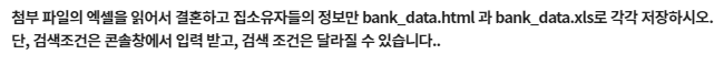 즉, 검색 콘솔 창에서 검색 조건과 내용을 입력하면 제시한 조건에 해당하는 데이터를 추출하여, excel파일과 HTML 파일로 저장하라는 문제다.