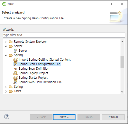 우선 해당 패키지에서 new를 눌러 bean 환경 설정 문서를 생성할 수 있다.