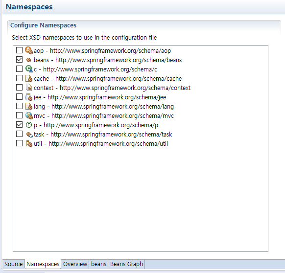 우선, Namespace를 사용하기 위해서는 xml 설정 파일에서 하단 Namespace 탭을 클릭해서 p:Namespace 사용에 체크해야한다.