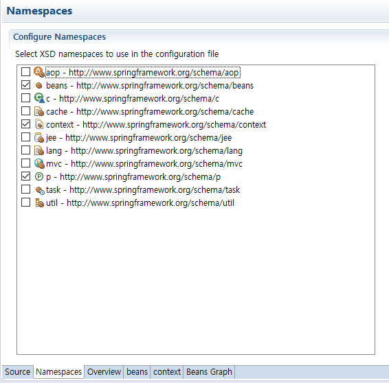 우선, component-scan은 context Namespace의 하나로, 다음과 같이 Namespace 탭에서 context를 선택하여 추가해야 한다.