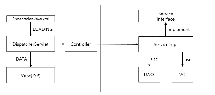 이 때, 일반적인 Dynamic Web Project 였다면, Controller 가 각 엑션을 구현받은 클래스들을 호출하여 사용하지만, Spring은 이를 Controller, Service, DAO, VO 등의 객체를 Spring Container가 자동으로 생성하도록 어노테이션을 통하여 설정할 수 있다.
