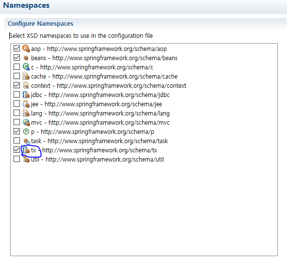 Spring에서 트랜젝션을 사용하려면 마찬가지로 네임스페이스를 설정해야한다.