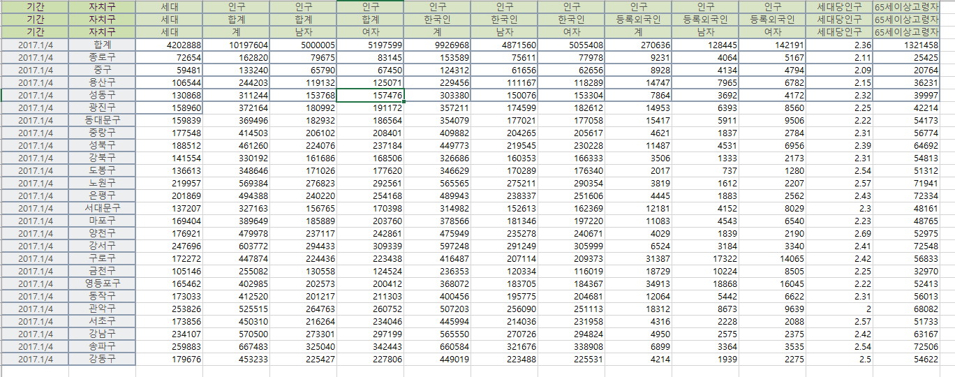 각 인구의 합계는 개별 데이터를 가져와서 합해주는 연산을 해주면 되니, 총 7개의 열만 가져와 작업을 했다.