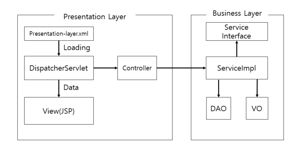 지금까지 Spring MVC 를 구현하면서 진행한 전체 작업을 "2-Layered" 아키텍쳐 스타일이라고 하며, 이를 그림으로 나타내면 다음과 같다.