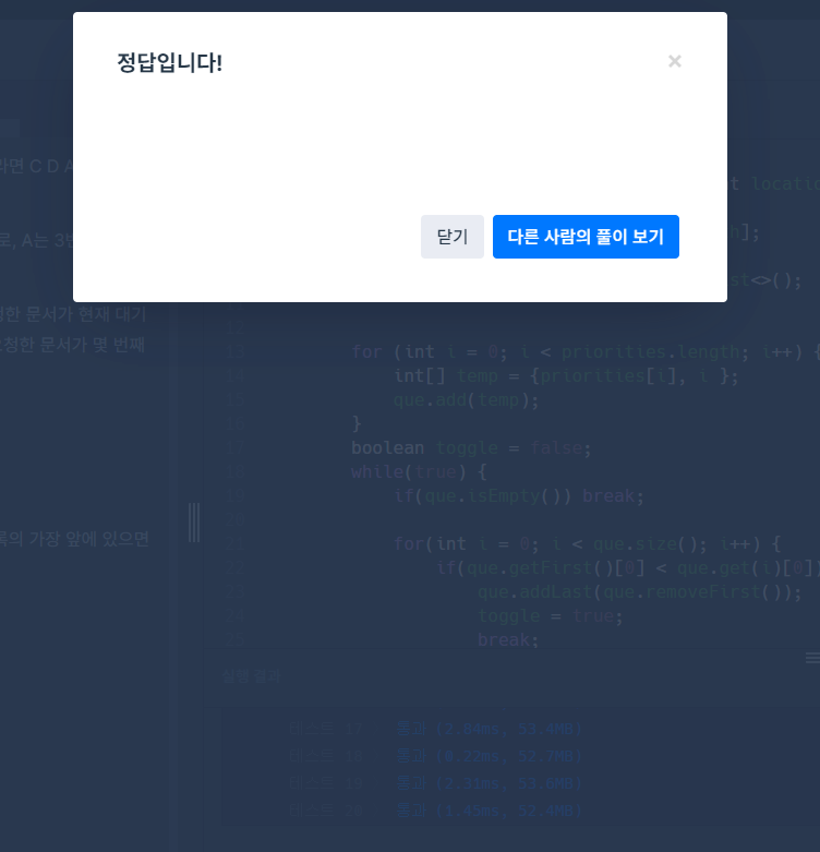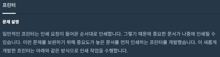그렇게 생각하면 중요도가 높은 문서의 위치를 기억하고 있다가 작업 마지막에 맨 앞 문서와 바꿔줘야 했기 때문에 단순 queue로 문제를 푼다고 가정하면 작업이 매우 복잡해지고, 어려워진다.