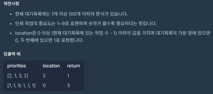 문제는 자신이 출력을 원하는 문서의 위치를 location 변수에 같이 주어, location에 위치한 문서가 언제 출력이 될 수 있는 지를 묻고 있기 때문에 문서의 중요도와 해당 문서의 원본 인덱스를 정수 배열들을 가지고 있는 List를 생성하여 문제를 풀었다.