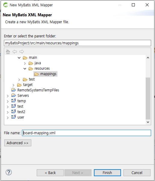 다음에는 DB에 연동할 SQL Mapper XML 파일을 아래 경로에 다음과 같이 생성한다.