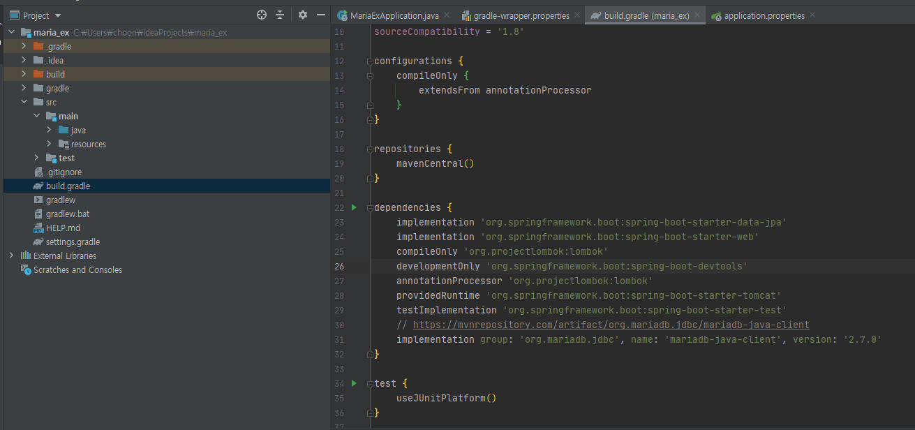 우선 Gradle Dependency에 Maria DB 드라이버를 추가해야 한다.