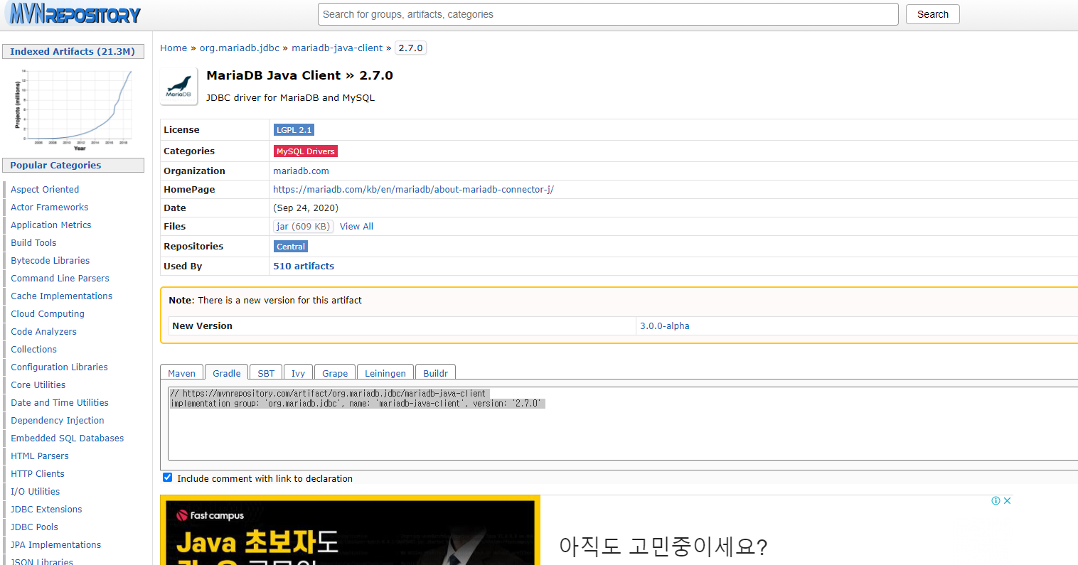 Maven Repository 에서 MariaDB Java Client를 검색하여, Gradle Dependency를 복사한다.