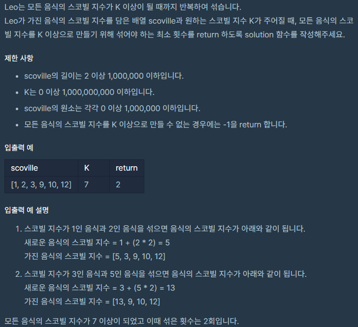우선 받은 스코빌 지수 배열을 모두 Priority Queue에 저장하여 insert와 동시에 스코빌 지수가 낮은 순으로 자동 정렬될 수 있게 만들어 주고, 스코빌 지수가 낮은 두 음식을 섞을 함수를 따로 만들어 저장해주면 끝!