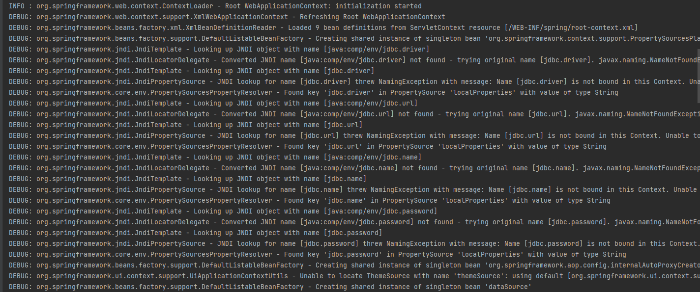 우선, 간단하게 위와 같이 springframework 구동과 프로젝트 핵심 관심을 DEBUG LEVEL로 콘솔창에 띄우도록 했다.