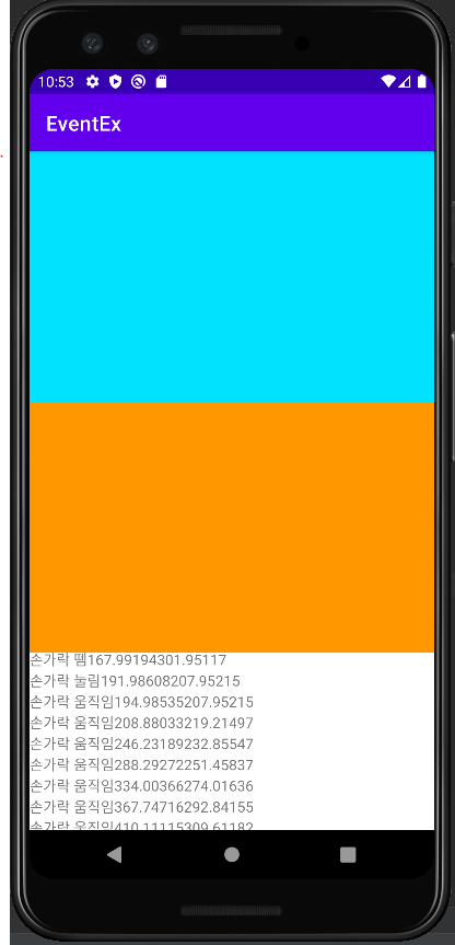 위와 같은 레이아웃을 구성한 뒤, 각 스크린을 터치할 때마다 해당 Event 와 좌표를 TextView에 삽입하여 표시하는 간단한 예제를 구성해보려고 한다.