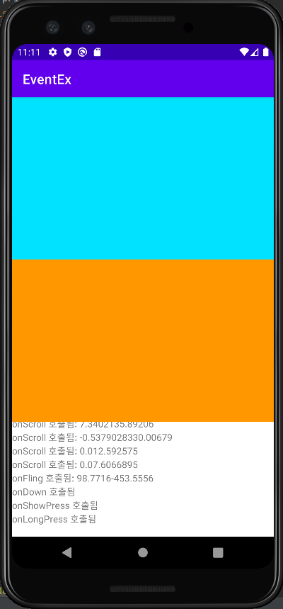 | onScroll() | 화면이 눌린 채 일정한 속도와 방향으로 움직였다 떼는 경우 |