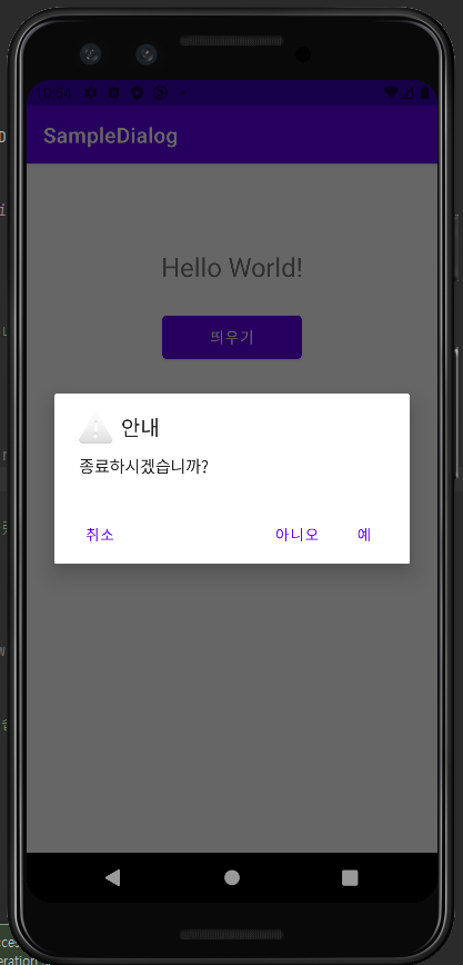 Toast와 Snackbar 가 사용자에게 간단한 알림을 띄우는 용도였다면, 알림 대화상자는 confirm과 같이 예, 아니오로 사용자의 응답을 처리하는 용도로 사용된다.