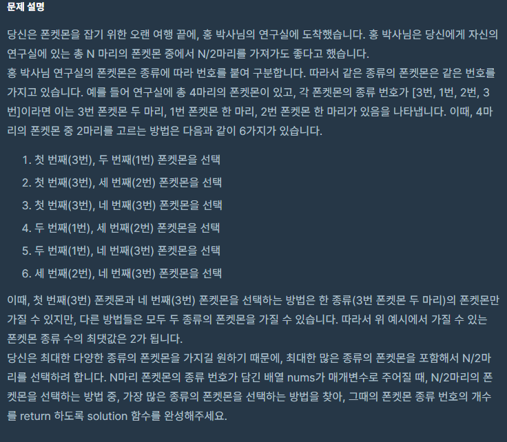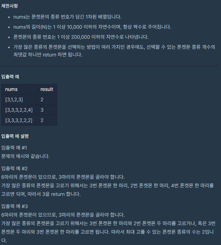 복잡해 보이지만, 사실 들어오는 입력 배열에서 중복 값을 제거한 포켓몬 종류의 수가