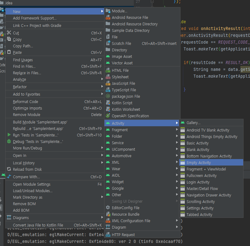 프로젝트를 생성하고, app 디렉토리에 new를 클릭하여 다음과 같이 액티비티를 하나 생성해준다.