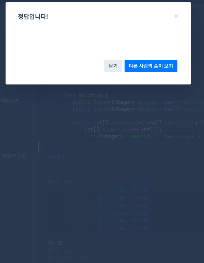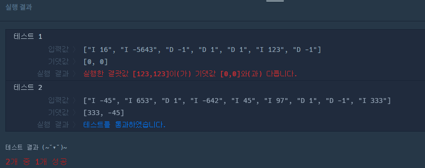 모든 명령어에 대한 연산이 끝난 뒤에는 각 큐에 남아있는 숫자를 서로 비교하여 두 Queue가 공통적으로 가지고 있는 수만 따로 받아, 받은 수의 집합에서 각각 최대, 최소 값을 구하는 식으로 코드를 작성했고, 당연히 될 것이라고 확신했다...