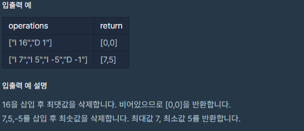 - 원소는 “명령어 데이터” 형식으로 주어집니다.- 최댓값/최솟값을 삭제하는 연산에서 최댓값/최솟값이 둘 이상인 경우, 하나만 삭제합니다.