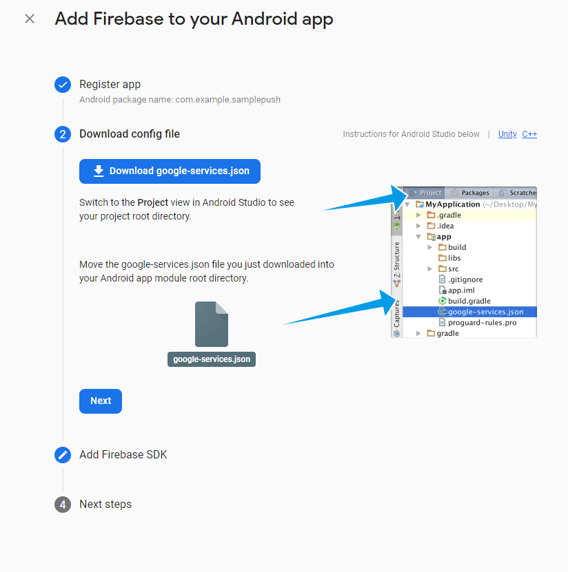 새 프로젝트 생성을 마치면, 해당 FCM 프로젝트에 사용할 Android 프로젝트를 등록해줘야 한다.