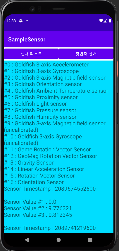 구현하기 그닥 어렵지는 않다. 첫번째 버튼을 누르면 모든 Type의 센서를 출력하고, 두번째 버튼을 눌렀을 때는 Sensor 리스트에 있는 센서의 값이 변경되었을 때 콜백 메서드를 호출하여 어떤 센서가 어떤 값으로 바뀌었는 지 확인할 수 있도록 한다.
