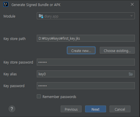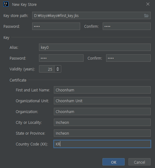 Create New 를 클릭하여 새 key store를 생성하고 서명 정보를 입력해준다.