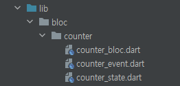 본격적으로 프로젝트를 하나 새로 생성한 뒤 blocs.counter 디렉토리를 생성하고, 아래와 같이 bloc, event 와 state를 생성해주자.