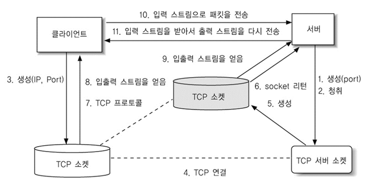 클라이언트의 TCP연결을 받기 위해서 ServerSocket 클래스의 객체를 생성해야 한다. 객체가 생성되면 대기상태가 되어 클라이언트의 TCP 연결 요청이 있을 때까지 기다리게 된다.
