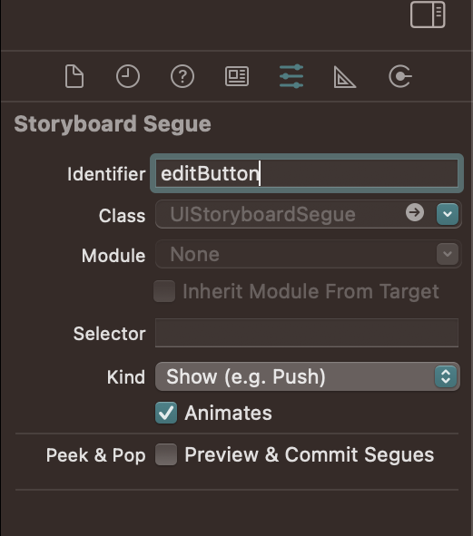이 때, 생성된 Segue way를 선택하여 아래와 같이 Identifier를 명시해주면 한 View가 여러 개의 Segue를 가지고 있을 때 구분하여 동작을 구분해줄 수 있다.