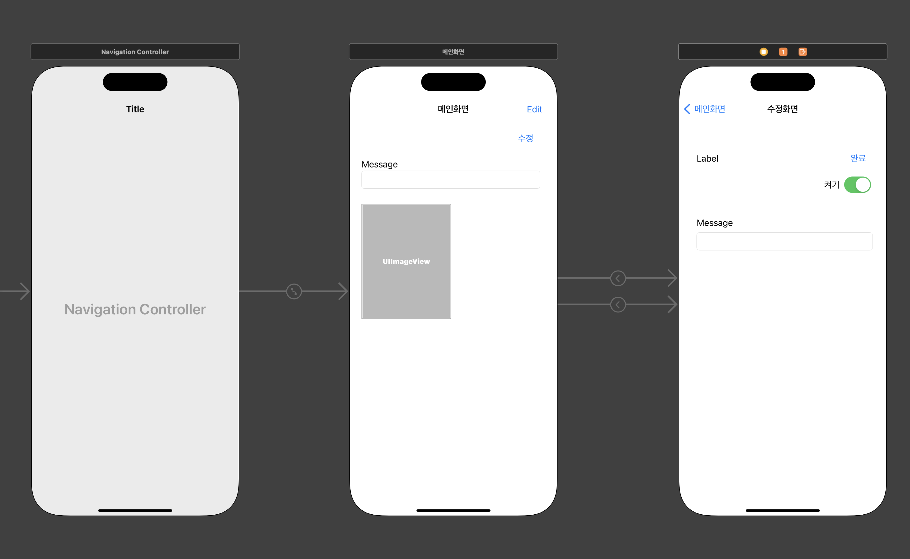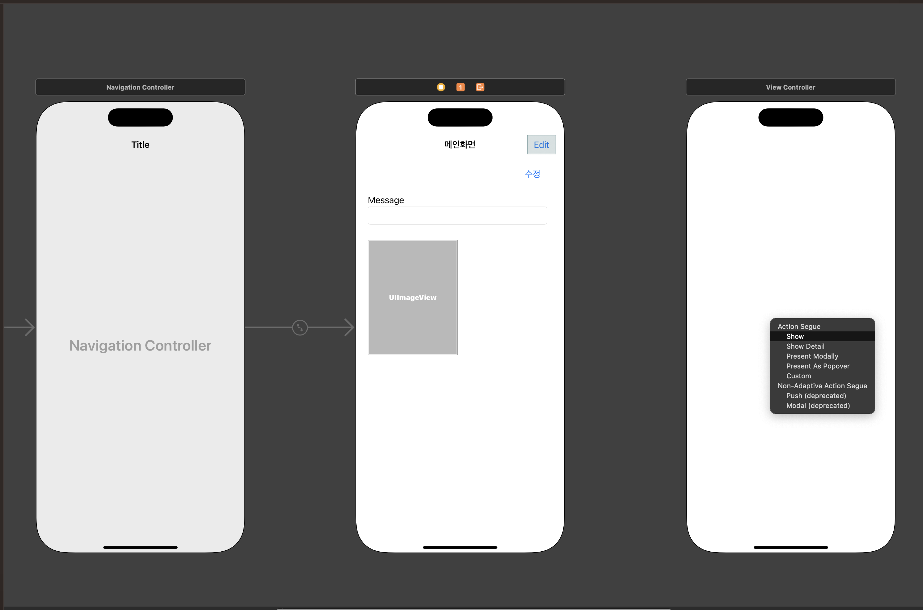 이후에 edit 버튼과 수정 버튼은 옆 View로 드래그하여 Segue way를 연결해준다.
