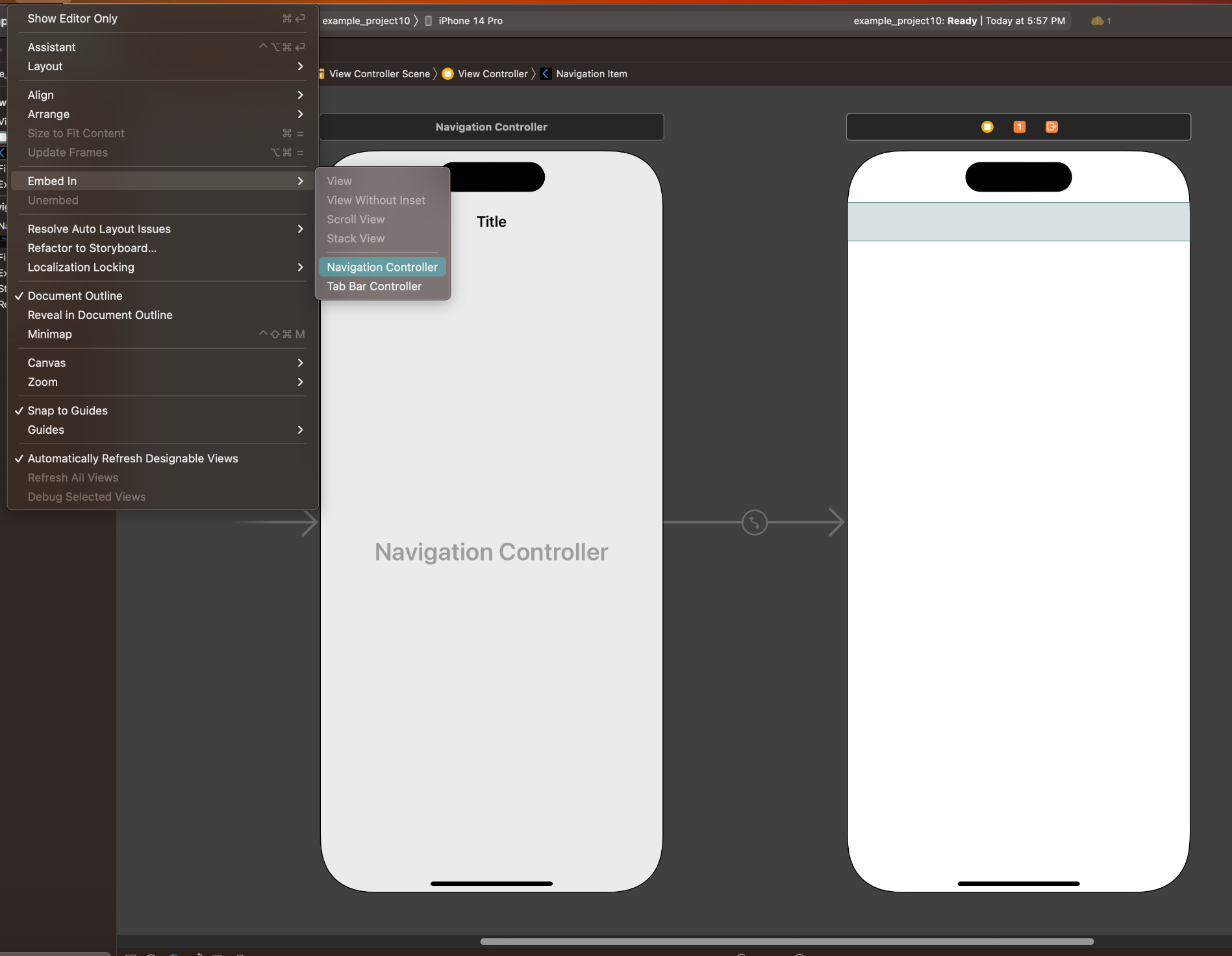 우선, 프로젝트를 새로 하나 생성한 뒤에 스토리보드에서 기존 뷰를 드래그하여 선택한 다음에 Editor > embed in > Navigation Controller 를 추가하면 아래와 같이 뷰가 하나 추가되며 연결된 상태가 된다.
