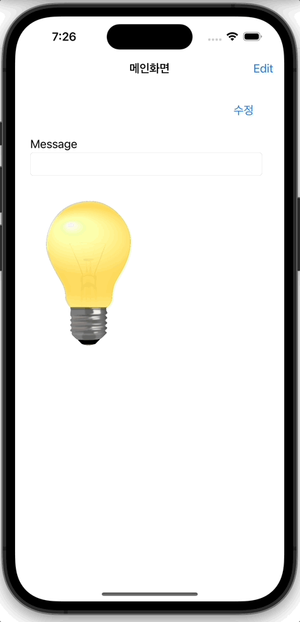 2. 수정 화면의 버튼을 이용하여 메인 화면의 전구 이미지를 제어하고, 메인 화면에 입력한 텍스트를 그대로 수정화면이 가져온다.