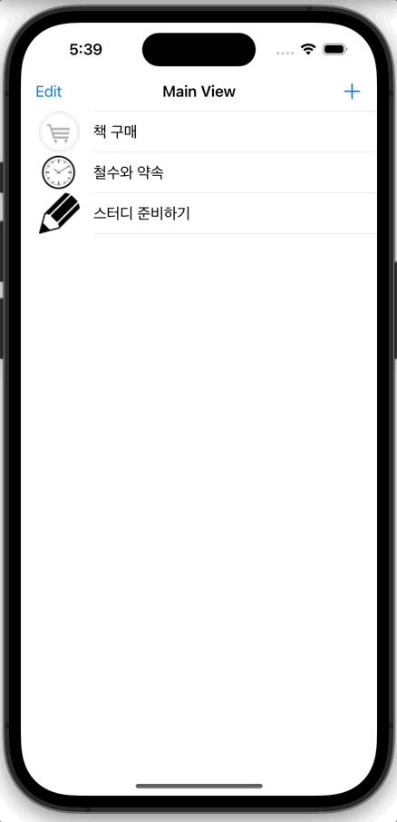 위와 같이 코드를 구성하여 왼쪽 바 버튼을 추가하고, 바 버튼을 터치하여 삭제 동작을 수행할 수 있게 되었다.