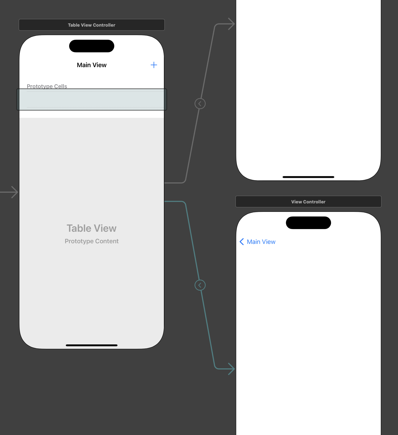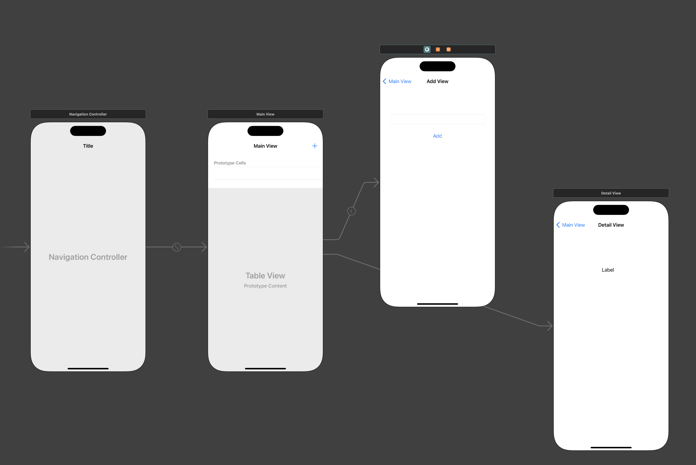 Table View Controller에서 Add 버튼을 하나 추가한 뒤, Add 버튼은 Add View로, Cell은 Detail View로 이동하도록 Segue Way를 이어준다.