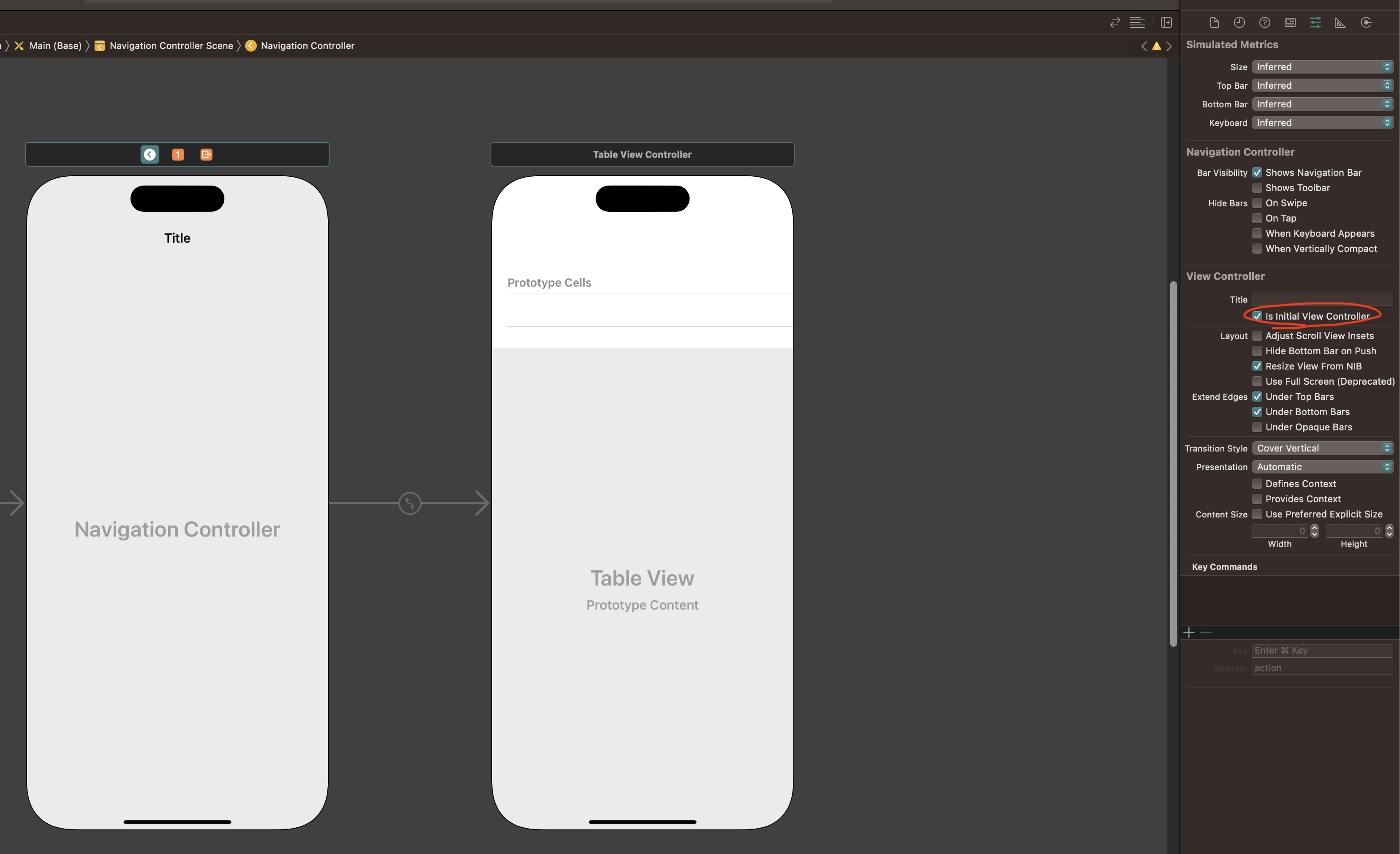 추가된 Navigation Controller가 앱이 실행될 때 처음으로 실행될 View가 되어야 하기 때문에 아래와 같이 설정해준다.