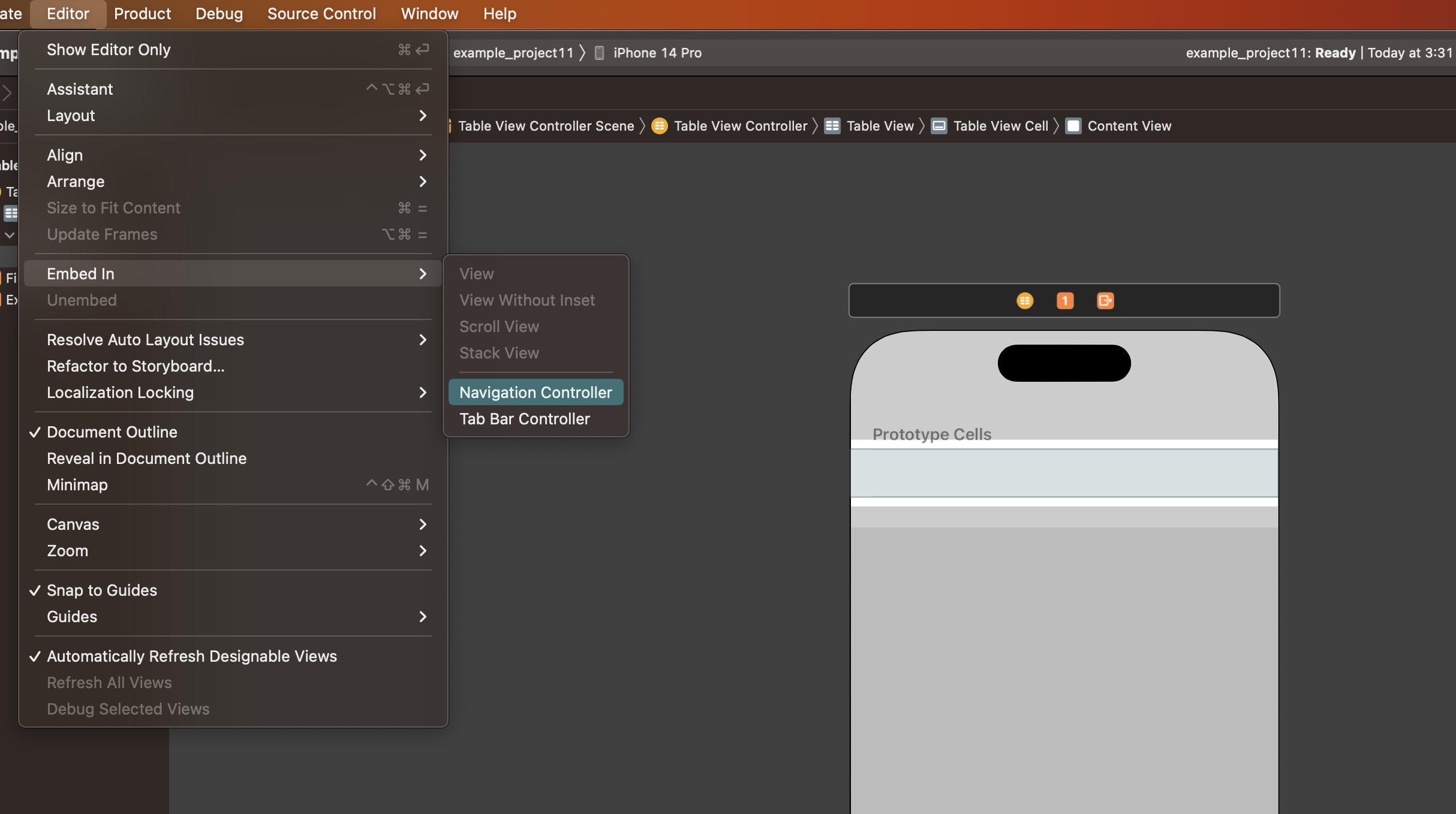 이제 테이블에 들어갈 새로운 리스트를 추가하고, 편집하려면 두 개의 뷰 컨트롤러가 필요하다. 두 개의 View Controller를 전환할 수 있게 해주는 Navigation Controller를 아래와 같이 Table View Controller의 Prototype Cells 를 클릭하고 추가한다.