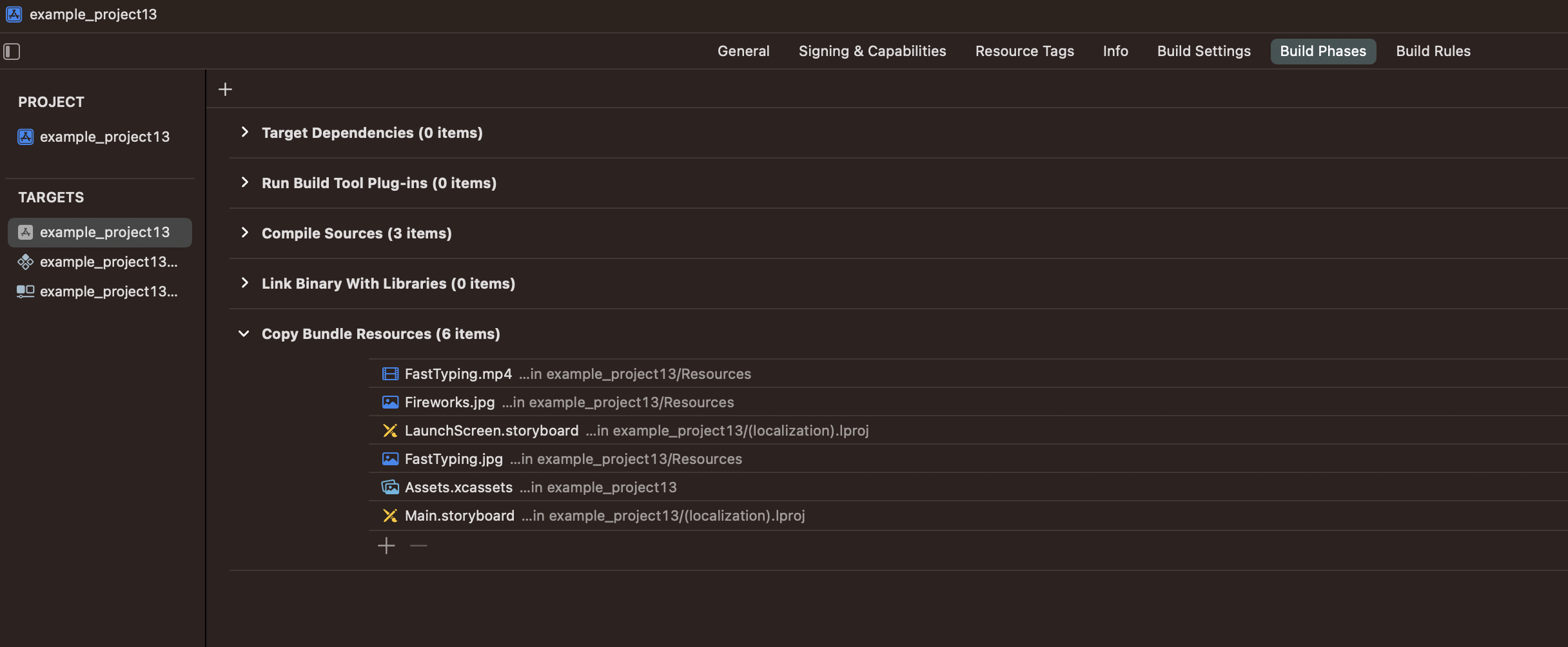 보통은 자동으로 삽입되지만, 반드시 프로젝트 클릭 > Target > Build Phases > Copy Bundle Resources 에 해당 리소스가 추가되었는 지 확인하고, 그렇지 않다면 수동으로 추가해주어야 단말이 해당 리소스를 읽을 수 있다.