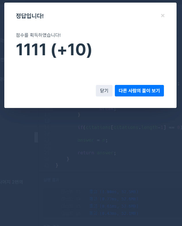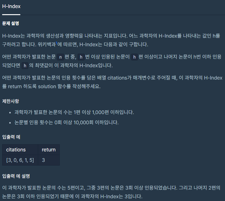 "생각보다 간단했다." 고 말할 뻔했다. 인용 횟수를 저장할 h와 해당 h값보다 큰 인용 횟수를 가진 정수의 개수를 가지는 n을 선언해준 뒤, citations 배열을 오름차순 정렬해주고, h 값에 해당하는 iterator를 ciataions의 길이에 빼주면 h보다 큰 수의 개수를 구할 수 있고, h의 최대 값은 n이 h보다 같거나 커지는 최초의 순간이므로, 그렇게 코드를 작성해주면 끝날 줄 알았다.