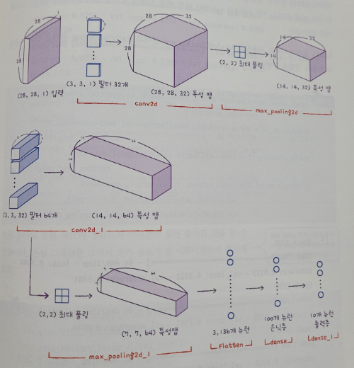 필터의 크기가 32이기 때문에 이 합성곱 층을 통과한 특성 맵은 32개의 깊이(채널)을 가지게 되며, 그 크기는 (28, 28, 32)가 될 것이다.