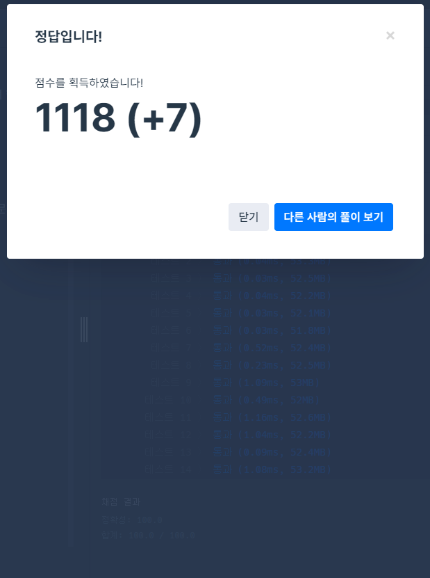 뭐...LV1인 만큼 딱히 어려울 거 없이 풀 수 있다. 아마 런타임 에러가 나오시는 분들은 모듈러 연산 쪽의 연산을 잘못했을 확률이 크므로, 정답 배열을 10개 이상으로 늘려서 확인하면, 어떤 부분이 문제인 지 알 수 있을 것이다.