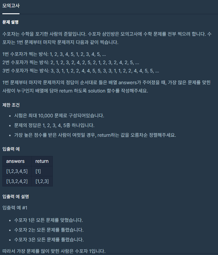 나머지 연산과 문제를 가장 많이 맞힌 1등 수포자 여러 명일 수도 있는 경우를 생각하여 코드를 작성하면 된다.