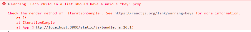 배열에서 각 문자열을 <ul> 태그 내부로 뿌려주는 간단한 코드이다. 실행은 잘 되는 거 같은데... 콘솔창을 확인해보면 아래와 같은 경고가 떠있다.