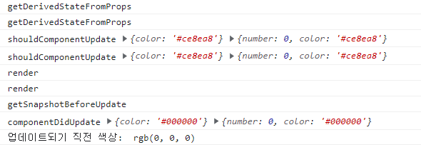 마찬가지로 리액트 v16.3 이후 만들어진 메서드이다. 이 메서드는 render에서 만들어진 결과물이 브라우저에 실제로 반영되기 직전에 호출된다. 주로 업데이트 직전의 값을 참고할 일이 있을 때 활용된다.