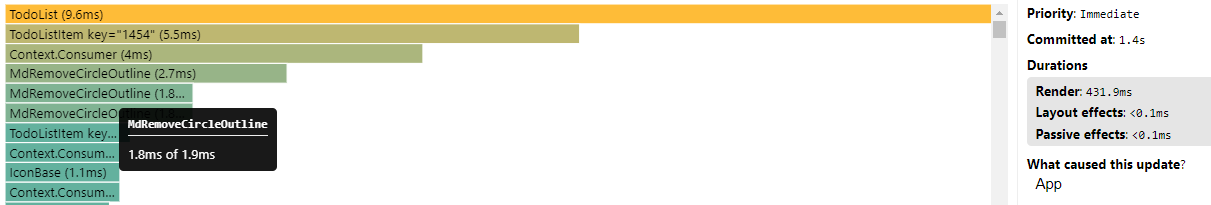 렌더링에 0.4초 정도가 소요됐다. Ranked List를 쭉 내려보면, 하나의 Todo만 클릭하여 Toggle해줬을 뿐인데도 불구하고 2500개의 todo가 모두 렌더링된 것을 확인할 수 있다.