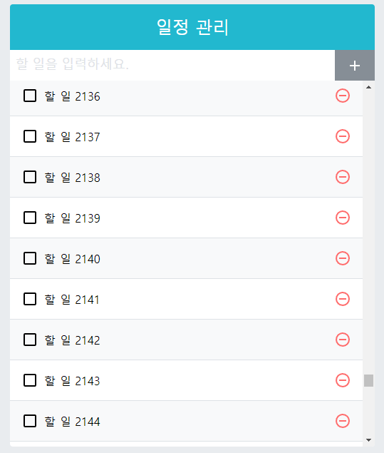 Todo List에서는 초기 데이터가 2,500개 등록되어 있는데, 실제로 화면에 나오는 항목은 아홉개이다. 나머지는 스크롤해야 볼 수 있다.