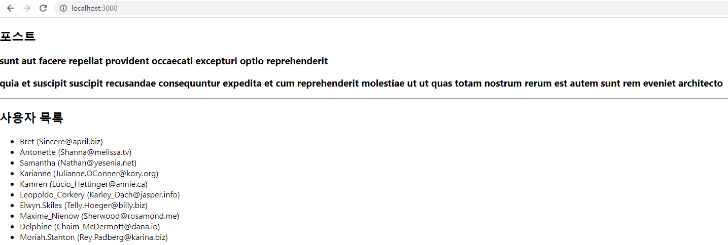컴포넌트는 컨테이너가 전달할 loadingPost, loadingUsers 로 현재 요청이 로딩 중인지 아닌지를 판단하고, 로딩이 끝났다면 post와 users 객체가 전달하는 값을 그대로 화면에 표시한다.